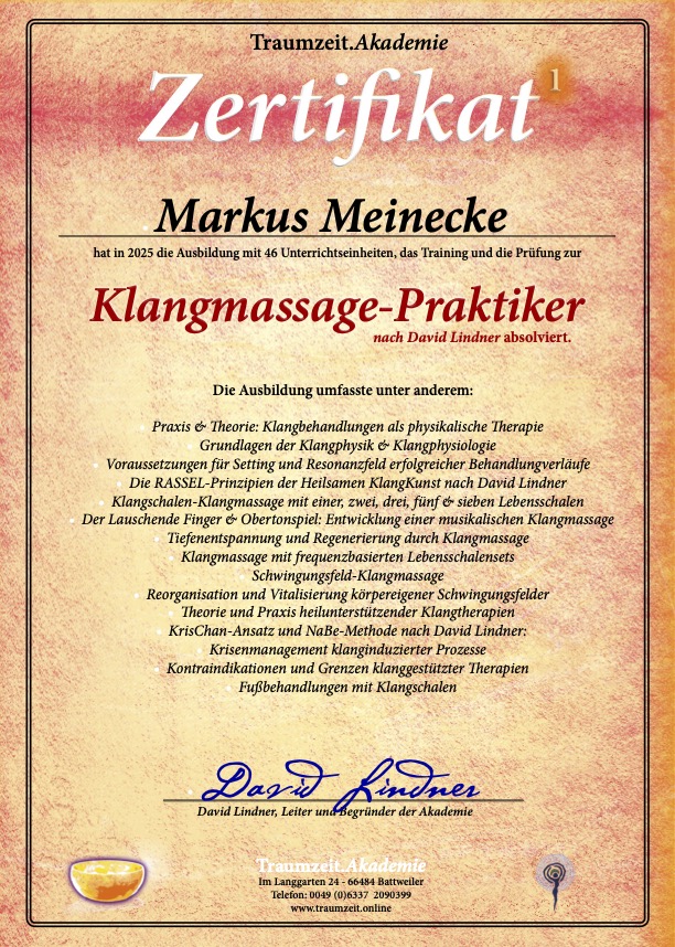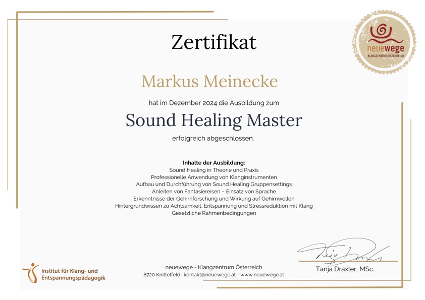 Aus dieser Erfahrung heraus begann ich mich immer mehr für die Wirkung von Klängen auf unseren Geist und Körper zu interessieren. Mein Instrumentarium entwickelte sich in diese Richtung weiter, und ich absolvierte zwei zertifizierte Ausbildungen zum Sound Healing Master sowie zum Klangmassage-Praktiker.