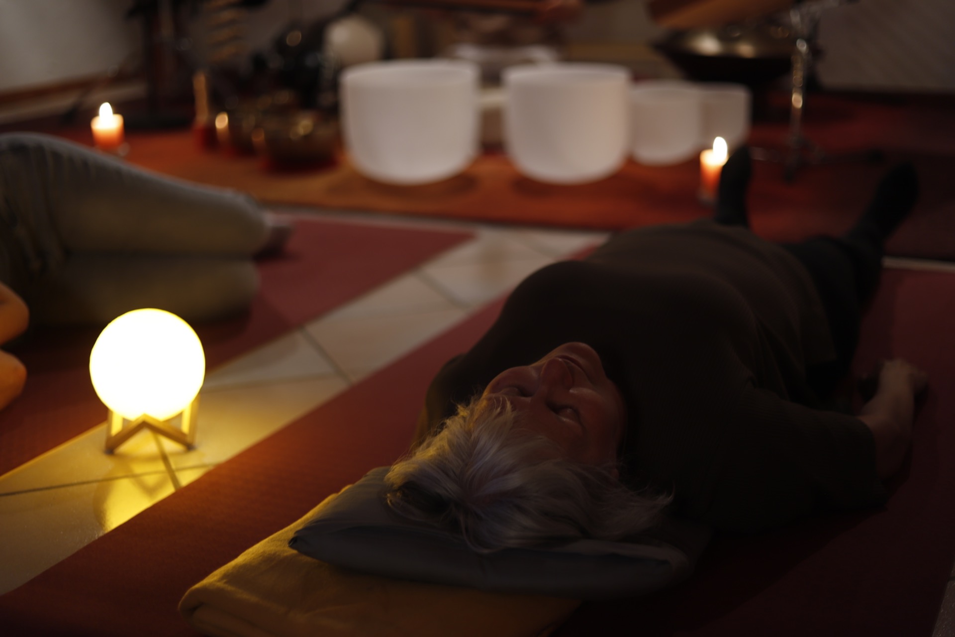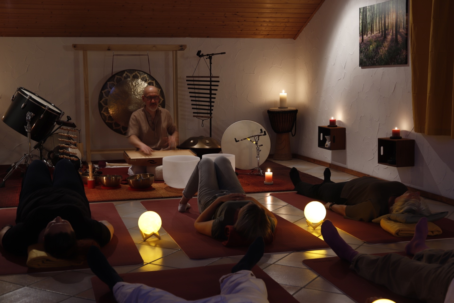 Bei einem Klangbad liegst du in einer Gruppe auf dem Rücken, bequem auf einer Matte oder Decke, oft mit Kissen und Decke unterstützt. Während du dich entspannst, erklingen die Instrumente um dich herum und füllen den Raum mit sanften, fließenden Klängen.